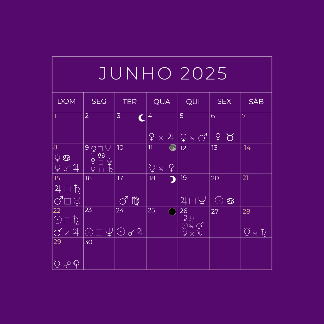 Vale lembrar que junho começa sob as influências do ciclo geminiano, com Sol em Gêmeos e uma lunação que teve início também no signo de Gêmeos.